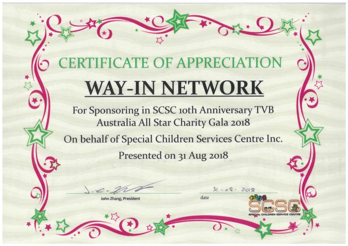 October 25, 2018/by adminCertificate of Appreciation for Sponsoring in SCSC 10th Anniversary TVB Australia All Star Charity Gala 2018