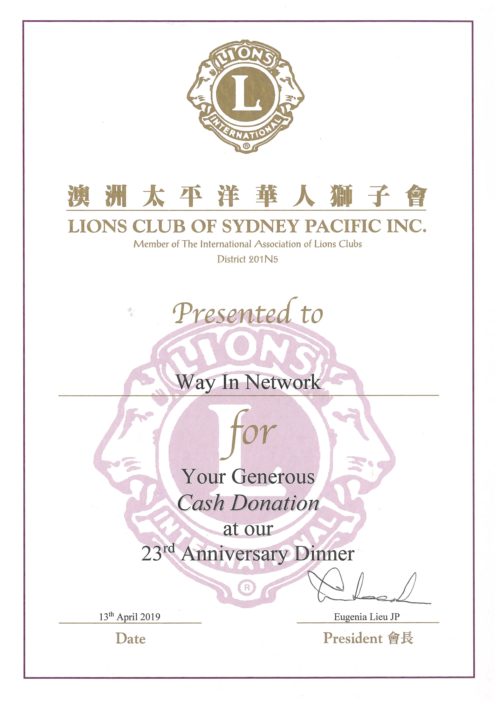 November 1, 2019/by adminLions Club of Sydney Pacific Inc. Presented to Way In Network for Generous Cash Donation at 23rd Anniversary Dinner