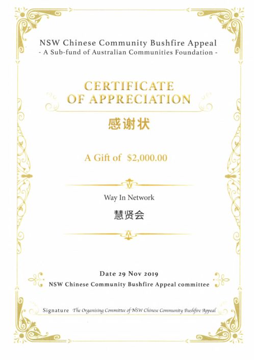 Certificate of Appreciation – NSW Chinese Community Bushfire Appeal